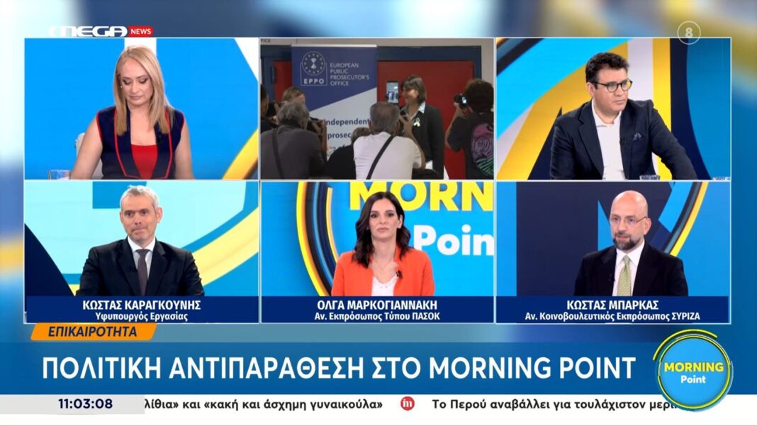 Στην εκπομπή “Morning Point” οι καλεσμένοι αντάλλαξαν απόψεις για τις τρέχουσες πολιτικές εξελίξεις στην Ελλάδα. Ο Κώστας Καραγκούνης, Υφυπουργός Εργασίας, αναφέρθηκε στις στρατηγικές της κυβέρνησης για την ενίσχυση της απασχόλησης και την κοινωνική προστασία.