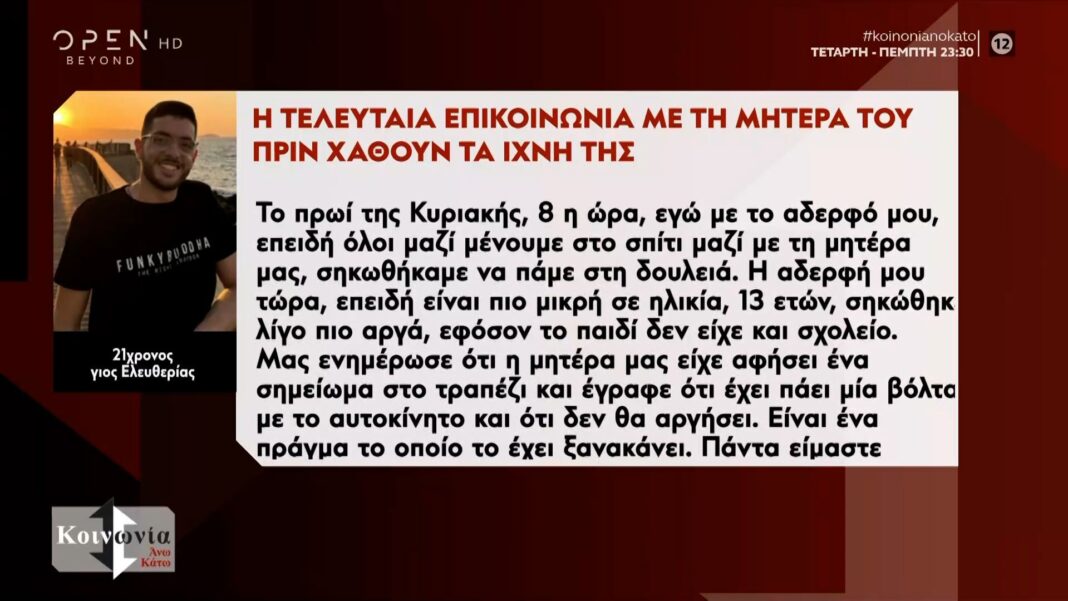 Ο γιος της Ελευθερίας αποκαλύπτει στοιχεία που ρίχνουν φως στην υπόθεση του θανάτου της, εστιάζοντας σε γεγονότα που συνέβησαν το τελευταίο διάστημα.