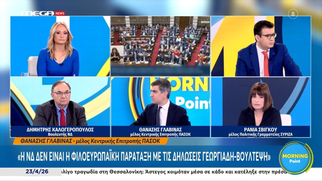 Ο Θανάσης Γλαβίνας, μέλος της Κεντρικής Επιτροπής του ΠΑΣΟΚ, εκφράζει τις επιφυλάξεις του σχετικά με τις πρόσφατες δηλώσεις των Άδωνη Γεωργιάδη και Σοφίας Βούλτεψη, υποστηρίζοντας ότι η Νέα Δημοκρατία δεν μπορεί να θεωρηθεί η φιλοευρωπαϊκή παράταξη που ισχυρίζεται. Ο βουλευτής της ΝΔ, Δημήτρης Καλογερόπουλος, συμμετέχει στη συζήτηση και αναλύει την τρέχουσα πολιτική κατάσταση.