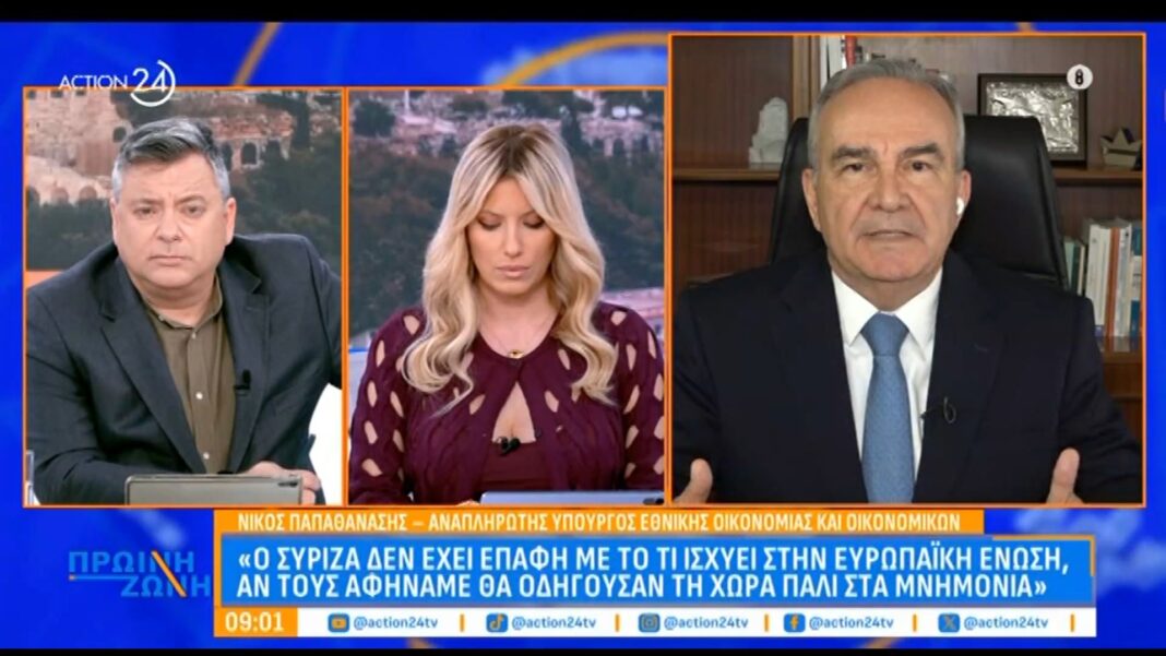 Ο Αναπληρωτής Υπουργός Εθνικής Οικονομίας και Οικονομικών, Νίκος Παπαθανάσης, εξέφρασε τις ανησυχίες του σχετικά με τις πολιτικές προτάσεις του ΣΥΡΙΖΑ, τονίζοντας ότι δεν έχει επαφή με τις πραγματικότητες της Ευρωπαϊκής Ένωσης. Υποστήριξε ότι αν οι συγκεκριμένες προτάσεις εφαρμοστούν, θα μπορούσαν να οδηγήσουν τη χώρα πίσω στα μνημόνια και σε οικονομική αστάθεια.