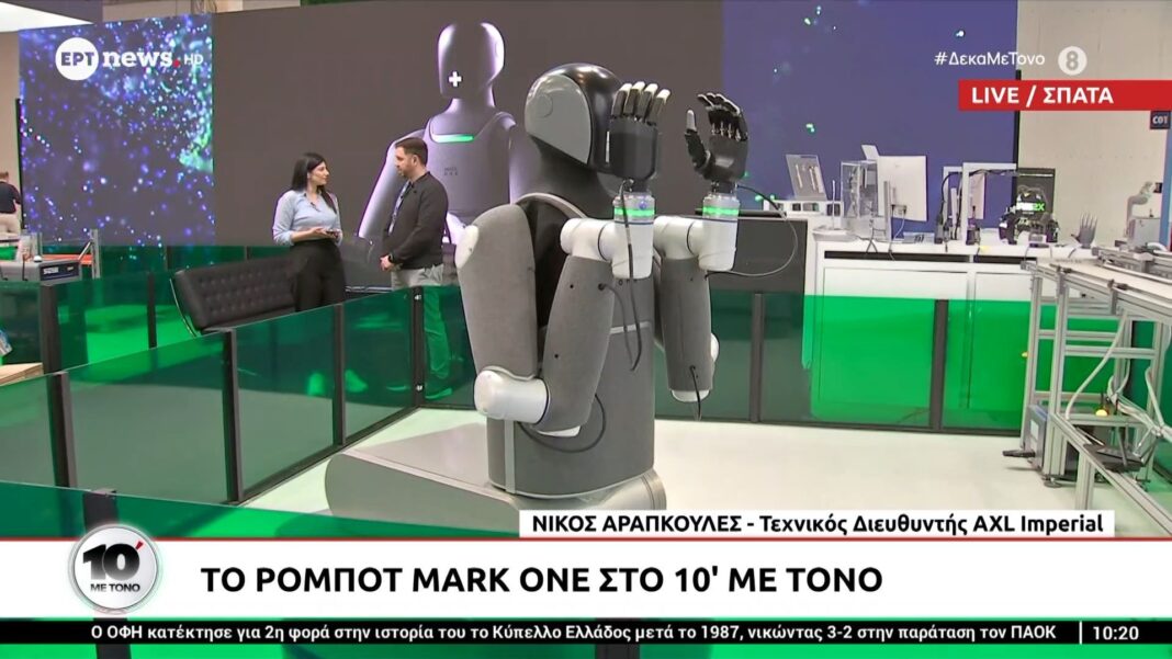 Ο Νίκος Αράπκουλες, τεχνικός διευθυντής της AXL Imperial, παρουσιάζει το ρομπότ Mark One σε μια ενδιαφέρουσα συνέντευξη. Το ρομπότ έχει σχεδιαστεί για να αναβαθμίσει τις λειτουργίες παραγωγής και να αυξήσει την αποδοτικότητα των βιομηχανικών διαδικασιών.