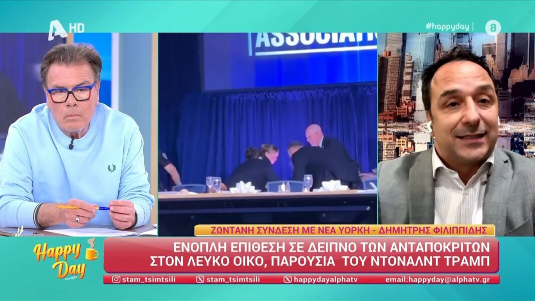 Ο Δημήτρης Φιλιππίδης αναφέρει τραυματίες από ένοπλη επίθεση κατά τη διάρκεια δείπνου ανταποκριτών στη Ν. Υόρκη με τον Ντ. Τραμπ παρόν, οι αρχές ερευνούν κίνητρα.