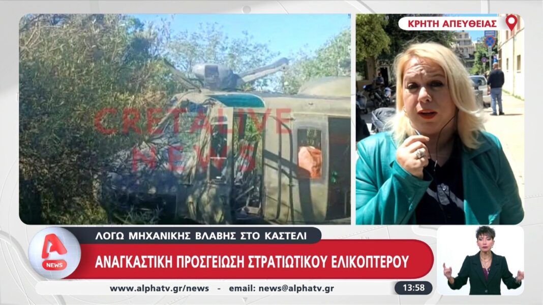 Στρατιωτικό ελικόπτερο αναγκάστηκε να προσγειωθεί στο Καστέλι, εξαιτίας μηχανικής βλάβης που προήλθε κατά την πτήση. Το περιστατικό σημειώθηκε το απόγευμα και οι επιβαίνοντες είναι καλά στην υγεία τους, ενώ η προσγείωση πραγματοποιήθηκε με ασφάλεια.