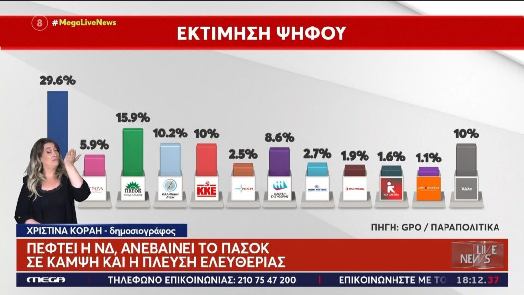 Πέφτει η ΝΔ, ανεβαίνουν ΠΑΣΟΚ – ΚΚΕ, σε κάμψη και η Πλεύση Ελευθερίας