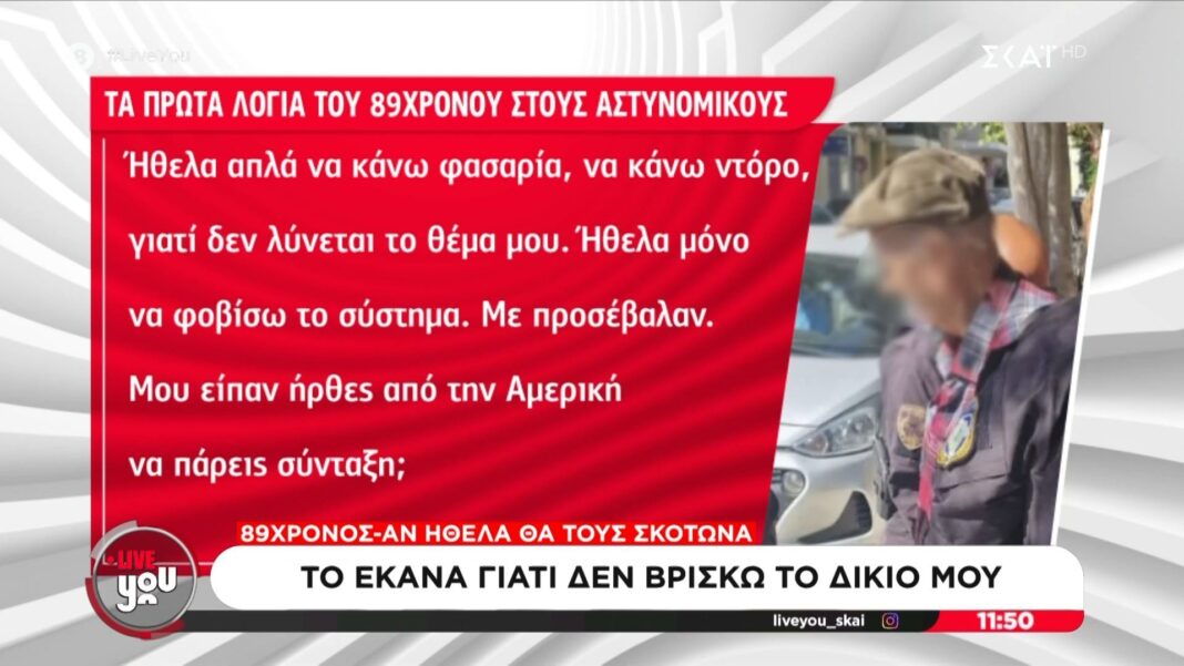 Ένας 89χρονος άνδρας προκάλεσε αναστάτωση σε ΕΦΚΑ και Ειρηνοδικείο, καταγγέλλοντας ότι δεν βρίσκει το δίκιο του. Κατά τη διάρκεια των επεισοδίων, δήλωσε πως αν ήθελε, θα μπορούσε να προκαλέσει σοβαρές ζημιές στους υπαλλήλους, τονίζοντας την απογοήτευσή του από τη διαδικασία.