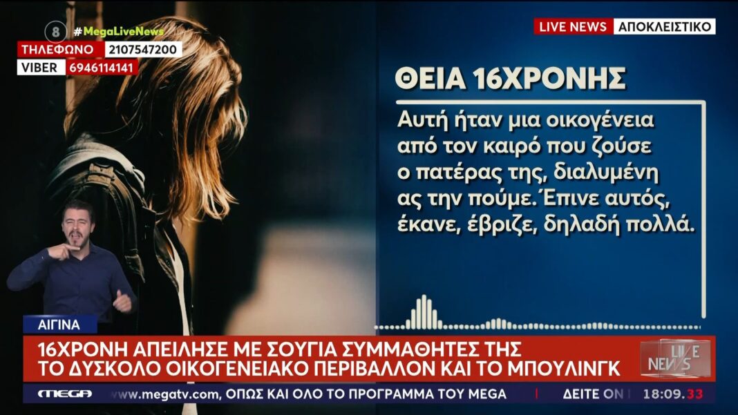 Σοκ έχει προκαλέσει το περιστατικό με 16χρονη μαθήτρια στην Αίγινα, η οποία απείλησε συμμαθητές της με σουγιά, εν μέσω ενός κλίματος έντονου bullying. Η κοπέλα φαίνεται ότι προχώρησε σε αυτήν την πράξη λόγω του δύσκολου οικογενειακού της περιβάλλοντος, που την έχει οδηγήσει σε ακραίες αντιδράσεις.