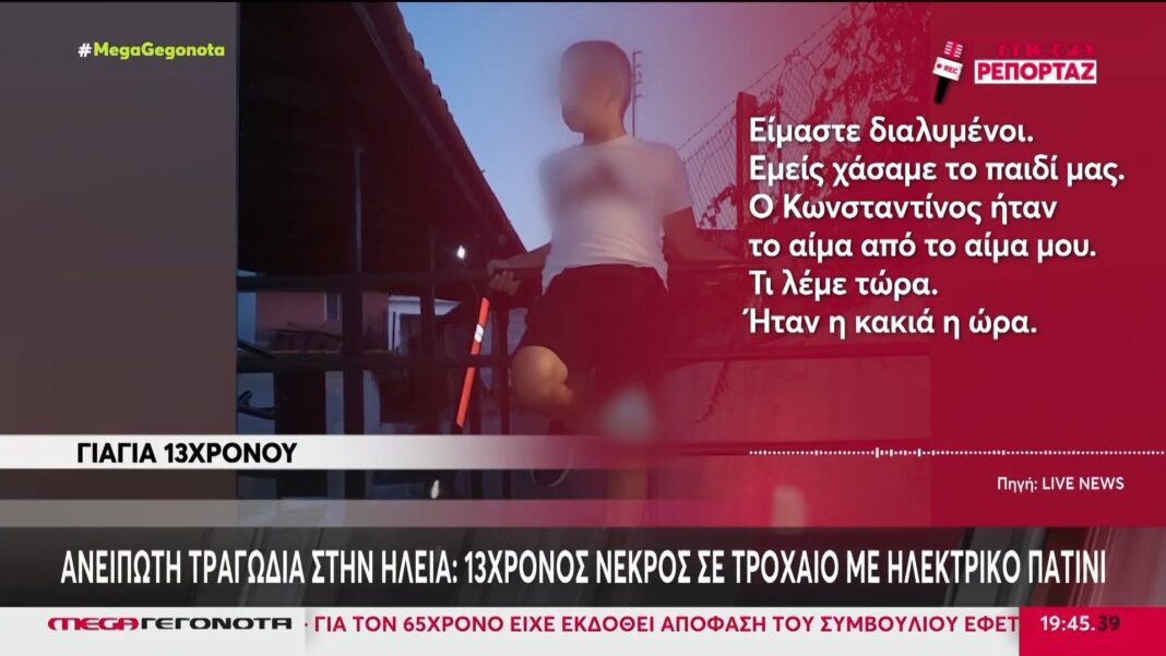 Σοκ έχει προκαλέσει η είδηση της τραγικής απώλειας ενός 13χρονου αγοριού στην περιοχή των Μακρισίων Ηλείας. Το παιδί, που οδηγούσε ηλεκτρικό πατίνι, συγκρούστηκε μετωπικά με αγροτικό αυτοκίνητο, με αποτέλεσμα τον θανάσιμο τραυματισμό του.