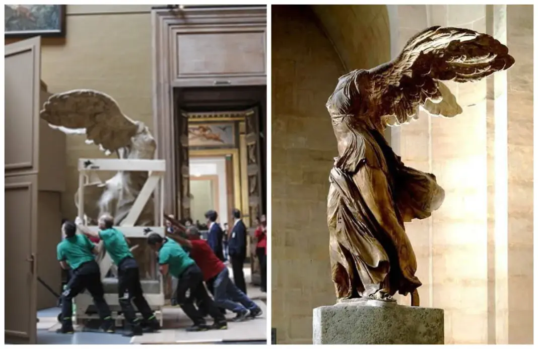 Οι επισκέπτες του Λούβρου θα μπορούν να αντικρίσουν ξανά το άγαλμα από τις αρχές του καλοκαιριού του 2014, γιατί η κλίμακα Νταρού, στην οποία φιλοξενείται, είναι κλειστή για ανακαίνιση. Σύμφωνα με το Κέντρο Έρευνας και Αποκατάστασης των Μουσείων της Γαλλίας, το άγαλμα ήταν βαμμένο με χρώμα.