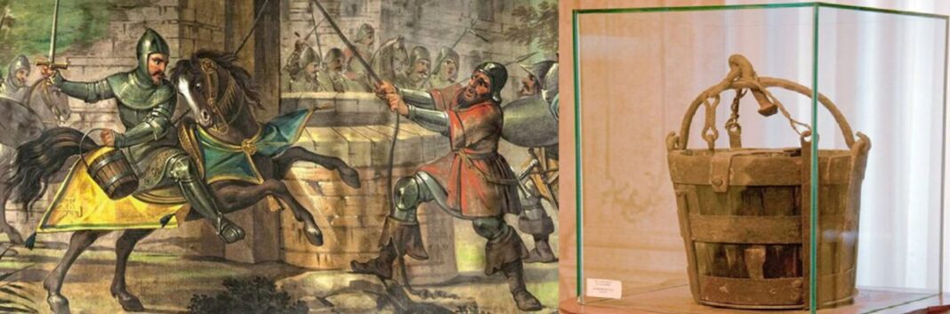 Μια νύχτα εκείνου του έτους, μερικοί Μοντενέζοι διείσδυσαν μέσα στα τείχη της πόλης της Μπολόνια. Βρήκαν έναν κουβά σε ένα πηγάδι, τον πήραν και τον έβγαλαν από την πόλη. Ήταν ενθουσιασμένοι, αφού το θεώρησαν σαν μια νίκη.