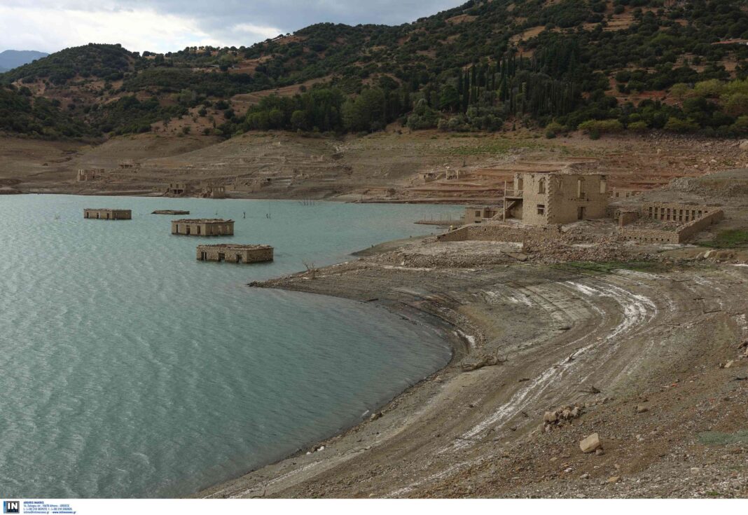 Το βυθισμένο χωριό Κάλλιο αναδύθηκε από τα νερά της τεχνητής Λίμνης του Μόρνου εξαιτίας της παρατεταμένης λειψυδρίας