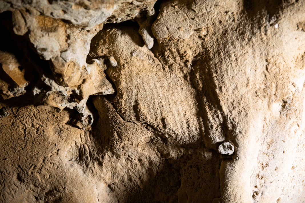 Το αποτέλεσμα ήταν γραμμές και τελείες που φαίνεται να έγιναν σκόπιμα, με τα δάχτυλα πάνω στον μαλακό ασβεστόλιθο — έναν τοπικό λίθο γνωστό ως τουφώ, φτιαγμένο από λεπτόκοκκα χαλαζιακά σωματίδια και απολιθωμένα κοχύλια.