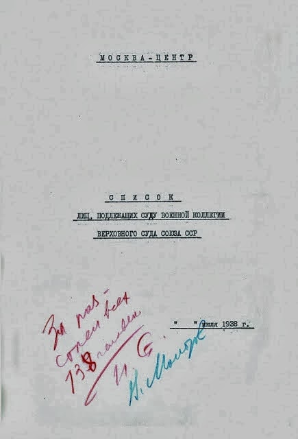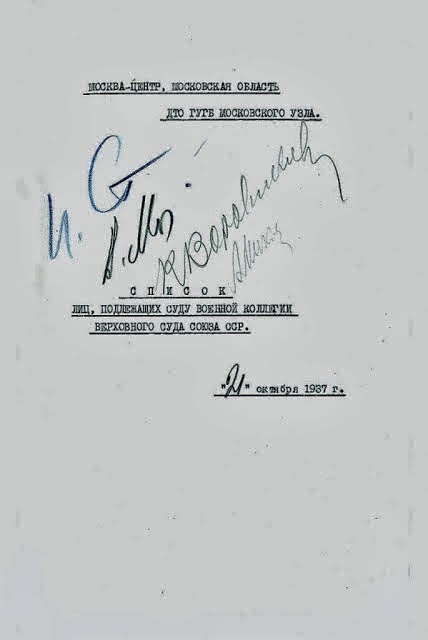 Στο πάνω μέρος των υπογραφών τα αρχικά του Ι.Β. Στάλιν με το διαβόητο μπλε μολύβι του Στο απόγειο της σταλινικής τρομοκρατίας ο κύριος εκτελεστής της διαβόητης φυλακής Λιουμπλιάνκα Βασίλι Μπλοχίν συμμετείχε στις πιο ηχηρές εκτελέσεις.