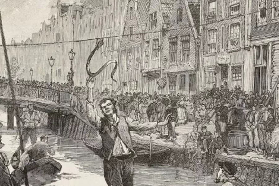 Υπήρχε κάποτε ένα παραδοσιακό ολλανδικό παιχνίδι γνωστό ως Eel Grabbing, σύμφωνα με το οποίο ένα σχοινί ήταν τεντωμένο ανάμεσα σε δύο σπίτια σε ένα κανάλι, και ένα ζωντανό χέλι δεμένο στη μέση. Αυτή είναι λοιπόν η ιστορία μιας εξέγερσης του Άμστερνταμ, που οδήγησε στο θάνατο 26 ανθρώπων.