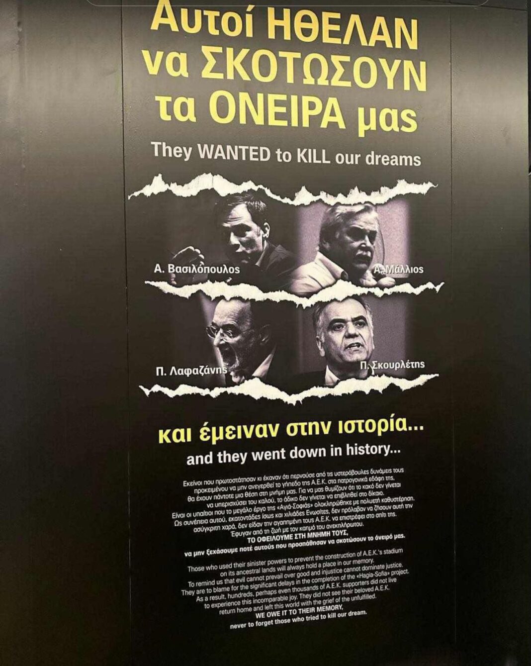 Κάπως έτσι, στον τοίχο της Allwyn Arena, ο Δημήτρης Μελισσανίδης φέρεται να κρέμασε μια εικόνα που δεν χαϊδεύει αυτιά. Μια εικόνα-υπενθύμιση για τα πρόσωπα που, στα χρόνια της μεγάλης αναγέννησης, στάθηκαν απέναντι στην ανέγερση του γηπέδου. Για εκείνους που —κατά τη συνείδηση του κόσμου της ΑΕΚ— πολέμησαν το όνειρο.