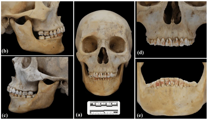 Η μελέτη τους, που δημοσιεύθηκε στο περιοδικό Anthropological Sciences, αποκαλύπτει ότι οι κόκκινοι λεκέδες στα δόντια της γυναίκας προκλήθηκαν από κιννάβαρι, χρωστική ουσία από το ορυκτό κινναβαρίτη, με βάση τον υδράργυρο.