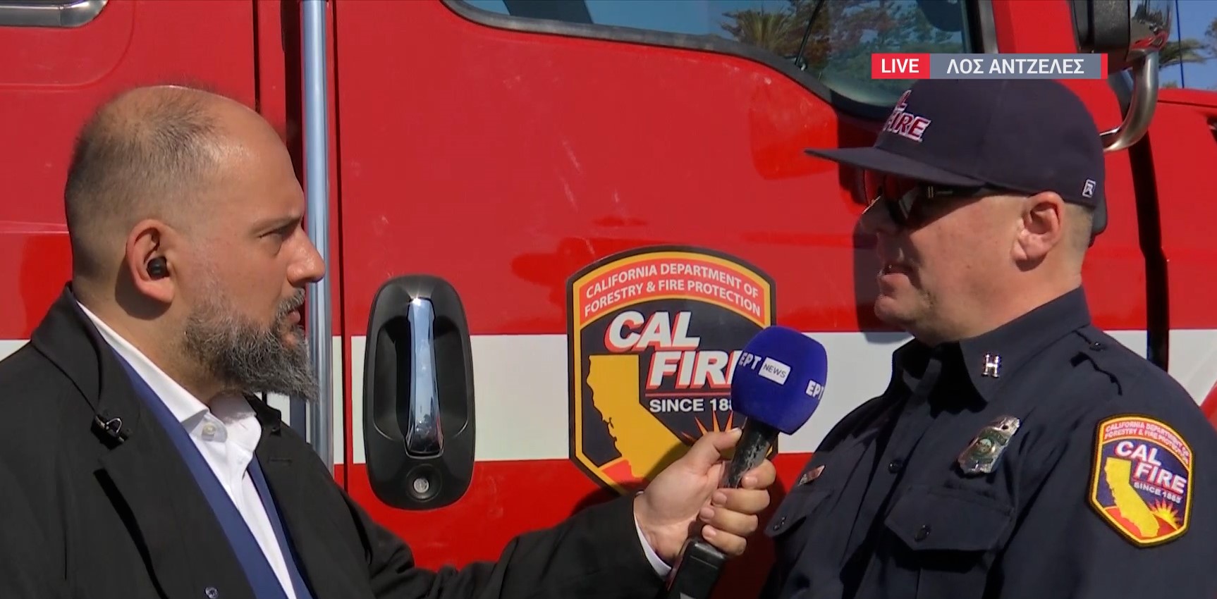 Ο απεσταλμένος του ΕΡΤNews στο Λος Άντζελες Αλέξανδρος Μόρντουντακ συνάντησε πυροσβέστη από το κέντρο πυροσβεστικής της Καλιφόρνια, ο οποίος έδωσε μια εικόνα για την κατάσταση των πυρκαγιών στο Λος Άντζελες.