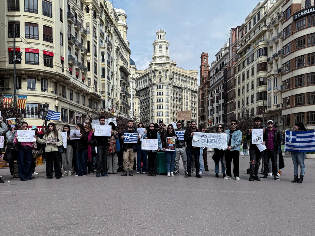 Συγκέντρωση στη Βαλένθια για τα θύματα των Τεμπών, με συμμετοχή φοιτητών και πολιτών που απαιτούν δικαιοσύνη και αναζήτηση της αλήθειας.