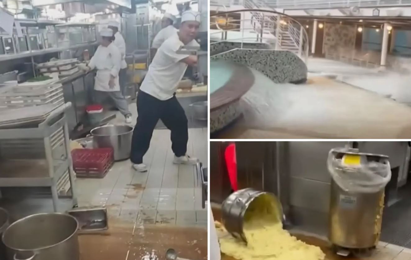 Τα πλάνα απαθανάτισαν το προσωπικό της κουζίνας του πλοίου να πιάνει σταθερά τους πάγκους για να ισορροπήσουν καθώς ο εξοπλισμός και τα εργαλεία έπεφταν στο μαγειρείο.
