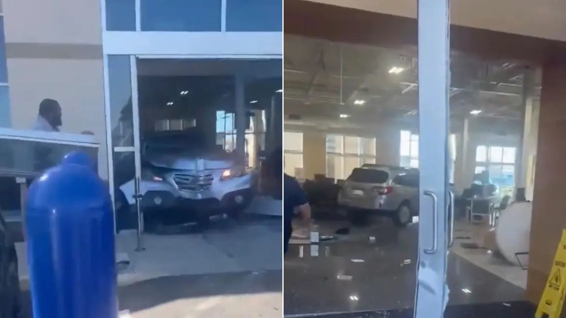 Πλάνα που καταγράφηκαν από κάμερες ασφαλείας δείχνουν την SUV να κινείται με την όπισθεν και να συνθλίβει την είσοδο της αντιπροσωπείας αυτοκινήτων, ενώ ένας υπάλληλος τρέχει πανικόβλητος για να σωθεί.