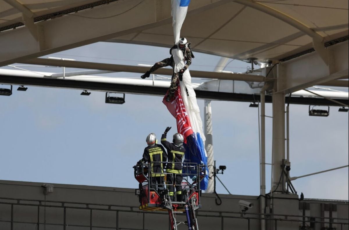 Δύο αλεξιπτωτιστές που μετέφεραν την μπάλα του αγώνα προσγειώθηκαν με ασφάλεια στον αγωνιστικό χώρο του Stade de Toulouse σε μια αναμέτρηση για το Κύπελλο Πρωταθλητριών, αλλά ο συνάδελφός τους ξέφυγε από την πορεία του και έμεινε να κρέμεται από την οροφή, καθώς το αλεξίπτωτό του πιάστηκε στην τέντα.