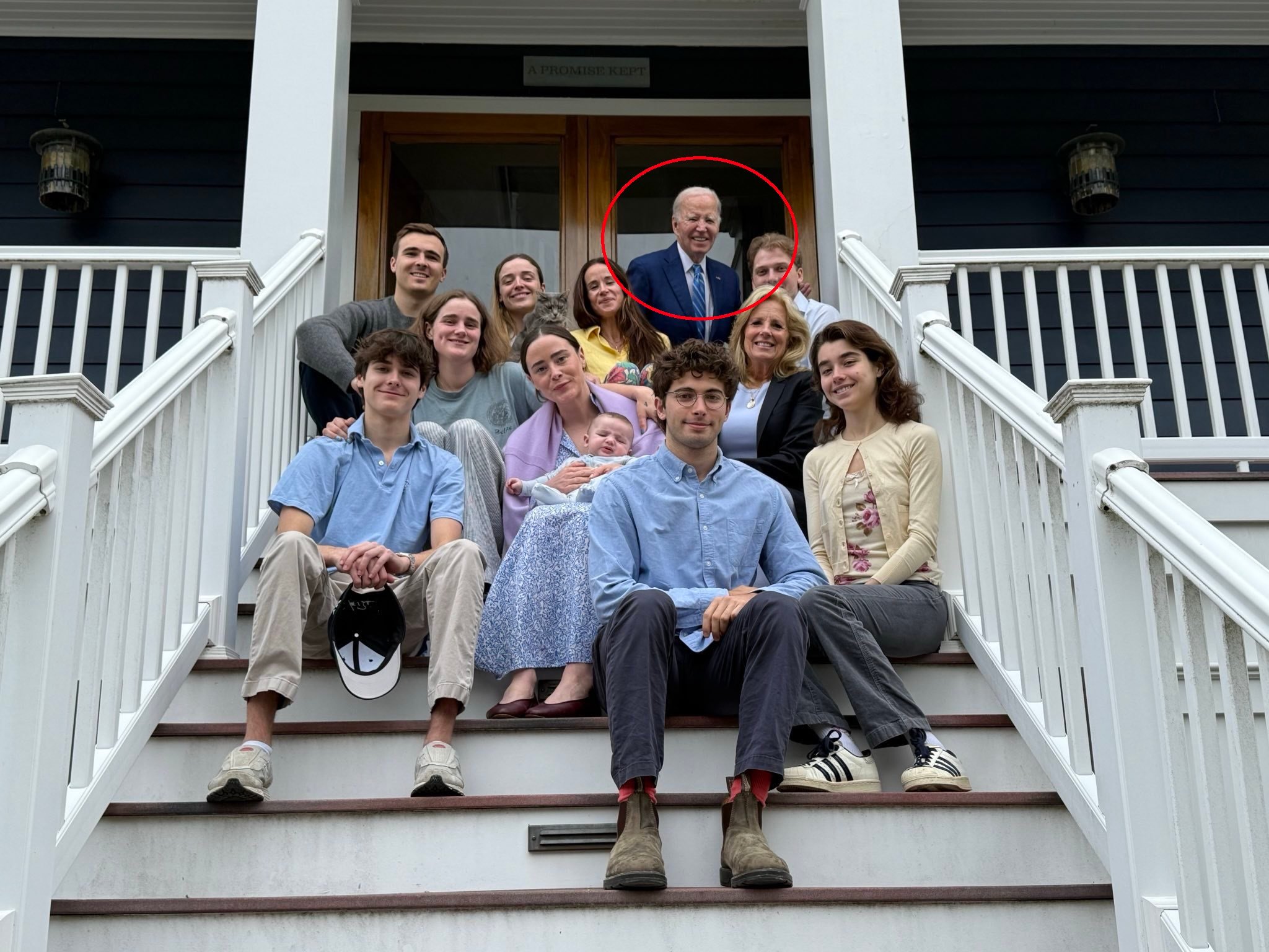 Ο πρώην Πρόεδρος φαίνεται να κάθεται στο πάνω σκαλοπάτι φορώντας μπλε κοστούμι. Ωστόσο, αρκετοί χρήστες των social media άρχισαν να αμφισβητούν αν ο Μπάιντεν ήταν πραγματικά παρών στη φωτογράφιση.