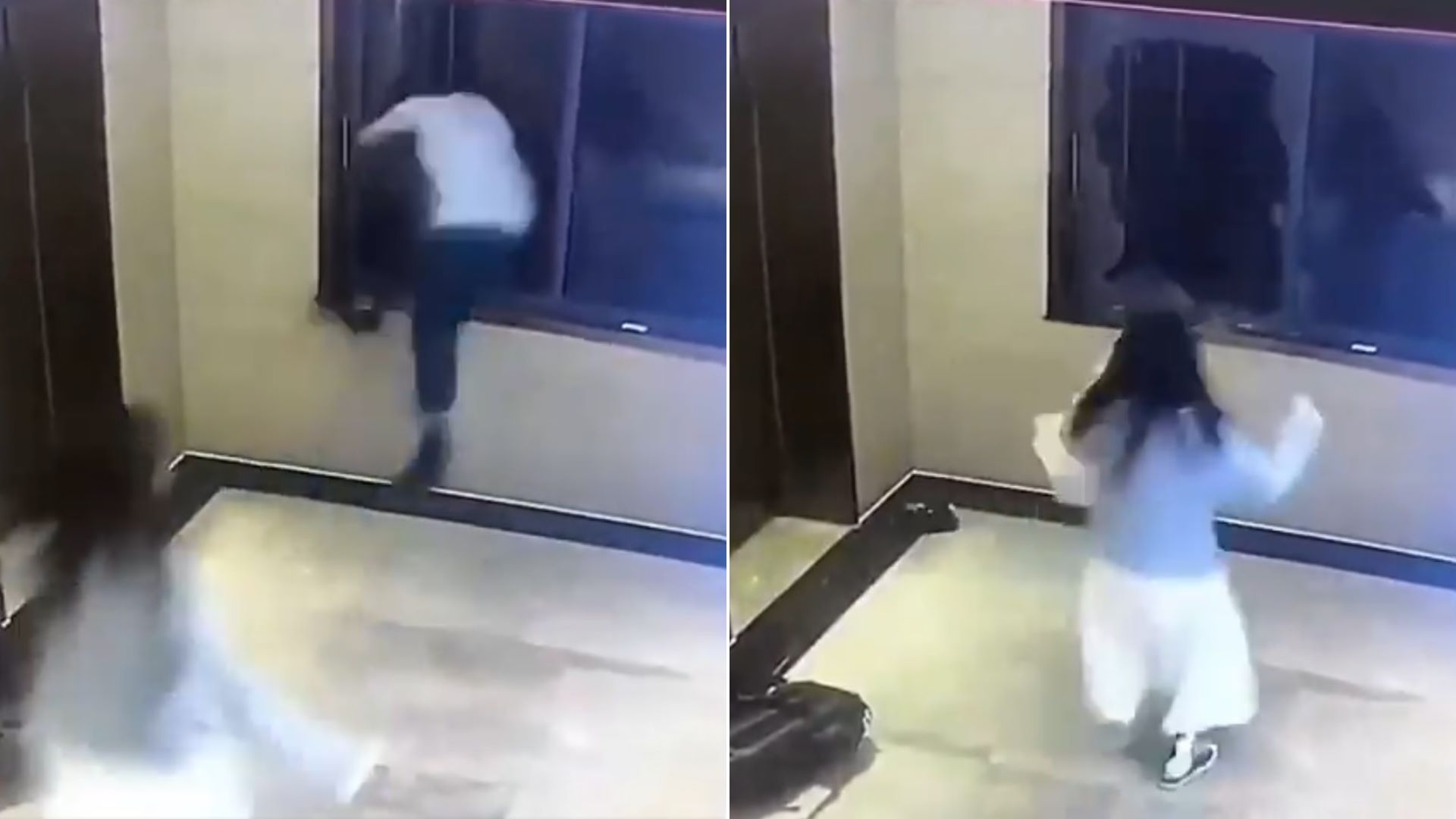 Σύμφωνα με τα βίντεο από τις κάμερες ασφαλείας, το ζευγάρι βρισκόταν δίπλα σε ένα παράθυρο και συζητούσε, όταν ξαφνικά ο άνδρας πέταξε την τσάντα του και έπεσε με φόρα στο παράθυρο.