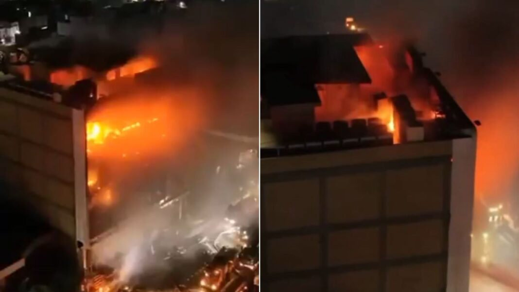 Βίντεο που κυκλοφορούν στα μέσα κοινωνικής δικτύωσης δείχνουν ένα πενταώροφο κτίριο να έχει τυλιχθεί στις φλόγες κατά τη διάρκεια της νύχτας, ενώ πυροσβέστες προσπαθούν να περιορίσουν τη φωτιά.