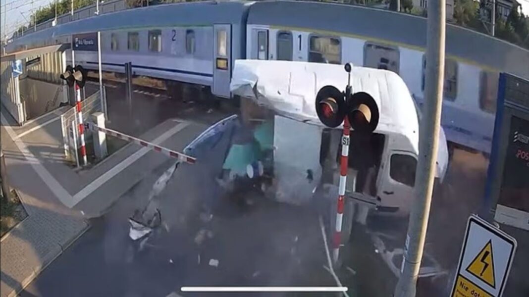 Σοκ προκαλούν τα πλάνα από κλειστό κύκλωμα τηλεόρασης που δείχνουν το λευκό βαν να τρέχει με μεγάλη ταχύτητα πάνω από τις γραμμές του τρένου σήμερα το πρωί στο πολωνικό χωριό Wola Filipowska, αφού αγνόησε τα φανάρια.
