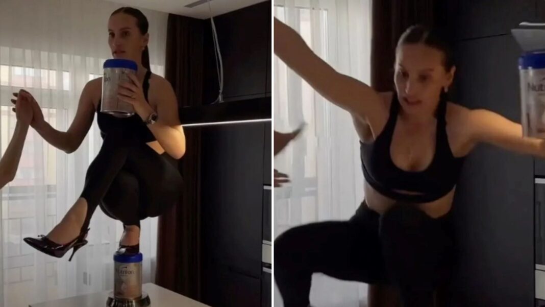 Το βίντεο δείχνει τη 32χρονη αισθητικό να προσπαθεί να ισορροπήσει πάνω σε μια γόβα στιλέτο, τοποθετημένη πάνω σε ένα βαζάκι βρεφικής τροφής, το οποίο είχε τοποθετηθεί πάνω σε μια αναποδογυρισμένη κατσαρόλα στην κουζίνα της.