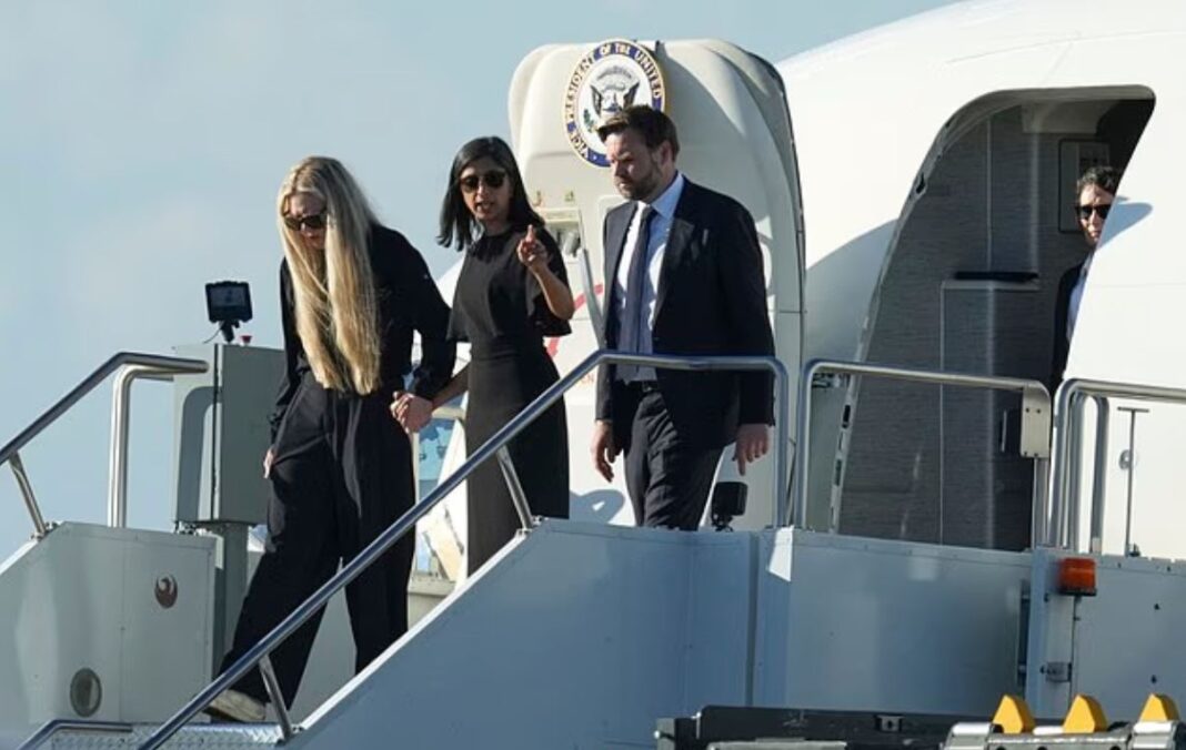 Οι δύο γυναίκες ήταν ντυμένες στα μαύρα και φορούσαν γυαλιά ηλίου, περπατώντας με βαρύ βήμα, ενώ από πίσω ακολουθούσε ο Τζέι Ντι Βανς.