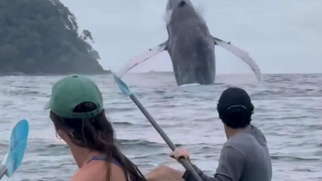 Εντυπωσιακή συνάντηση τουριστών με μητέρα και μικρή φάλαινα κατά τη διάρκεια καγιάκ στα ακτογράμμη της Κόστα Ρίκα, με θεαματικές βουτιές και απρόσμενη εμπειρία