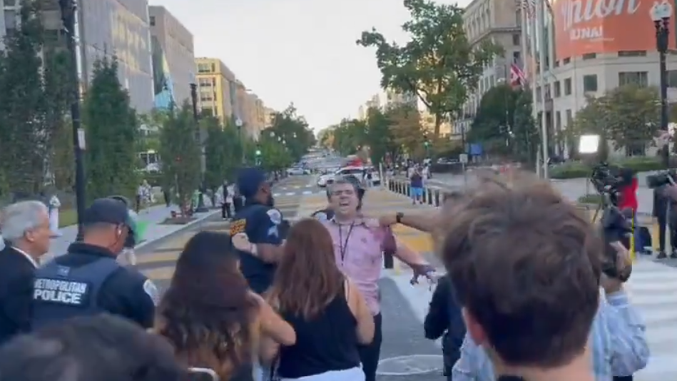 Ο άνδρας φωνάζει ότι είναι δημοσιογράφος καθώς τον συγκρατούν άνδρες της Μητροπολιτικής Αστυνομίας της Ουάσινγκτον, φαίνεται σε άλλο βίντεο, που δημοσίευσε η δημοσιογράφος του Free Beacon, Τζέσικα Κοστέσκου μετά την κατάσβεση της φωτιάς.
