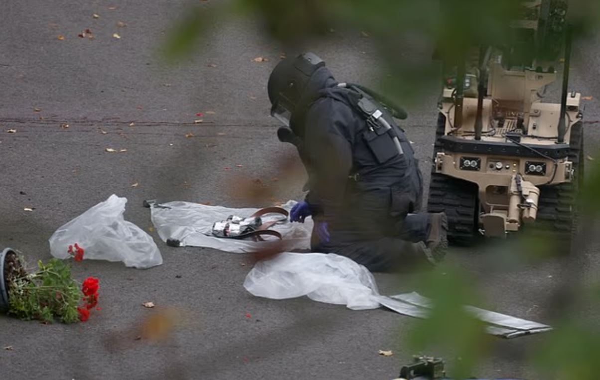 Η εικόνα του δράστη, η οποία επαληθεύτηκε από το BBC, τραβήχτηκε ακριβώς έξω από τον περιμετρικό φράχτη της σκηνής το πρωί της Πέμπτης. Μια φωτογραφία από τη σκηνή δείχνει το σώμα του δράστη να εξετάζεται από πυροτεχνουργό.