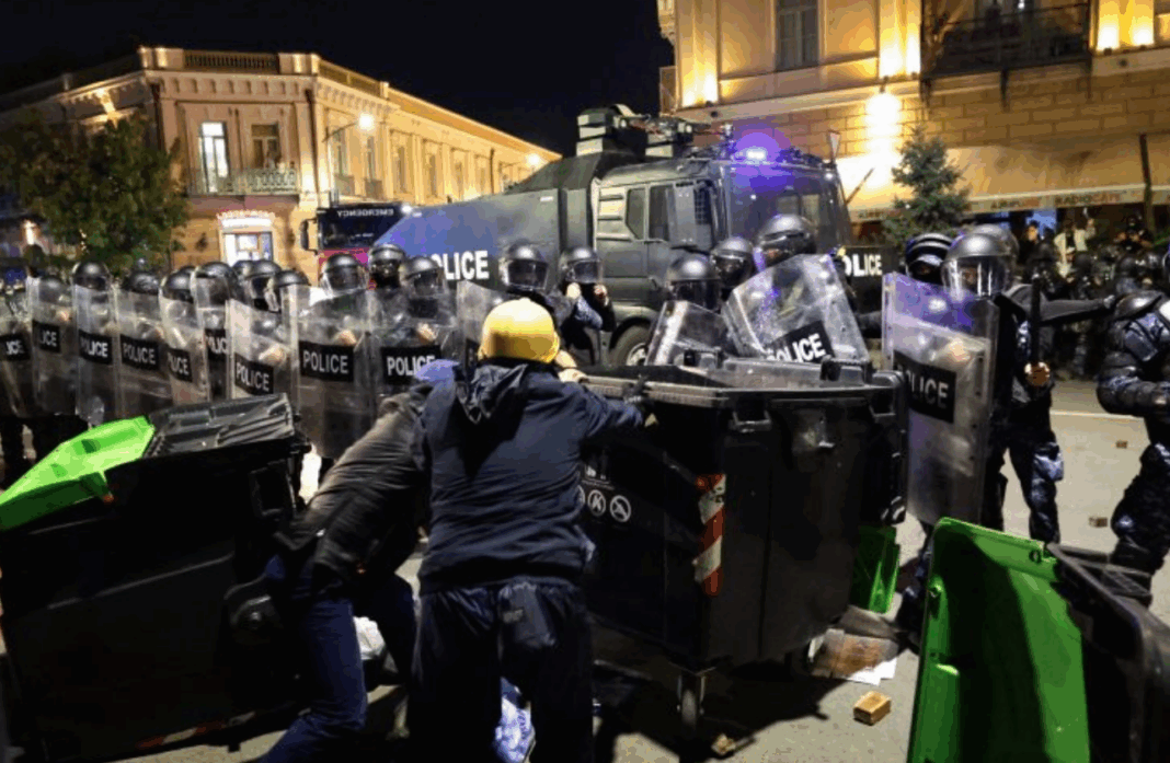 Οι εντάσεις κλιμακώθηκαν καθώς οι διαδηλωτές έκαναν πορεία στο κέντρο της πόλης, κρατώντας σημαίες της Γεωργίας και της ΕΕ.
