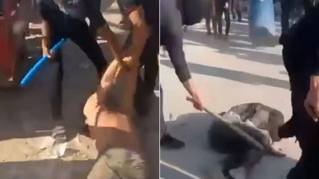 Σε ένα από τα πιο συγκλονιστικά αποσπάσματα, δύο άνδρες φαίνονται να σέρνονται στο έδαφος και να ξυλοκοπούνται άγρια από άτομα που, σύμφωνα με το Ισραήλ, είναι ένοπλοι και μασκοφόροι της Χαμάς. Ένας από τους άνδρες, με μαύρο σάκο στο κεφάλι και τα χέρια δεμένα πίσω από την πλάτη, φαίνεται να σφαδάζει καθώς οι επιτιθέμενοι τον χτυπούν με σιδερένιες ράβδους στα γόνατα με δύναμη.