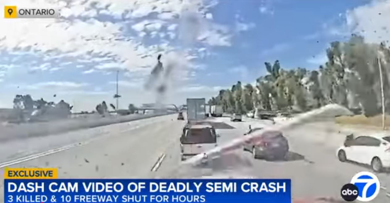 Πλάνα από κάμερα αυτοκινήτου δείχνουν τον 21χρονο Jashanpreet Singh να τρακάρει με πολλά αυτοκίνητα ενώ βρισκόταν πίσω από το τιμόνι του κόκκινου μεγάλου φορτηγού στον αυτοκινητόδρομο 10 προς τα δυτικά λίγο μετά τη 1 μ.μ. την Τετάρτη, σύμφωνα με το βίντεο που εξασφάλισε για πρώτη φορά το ABC7.