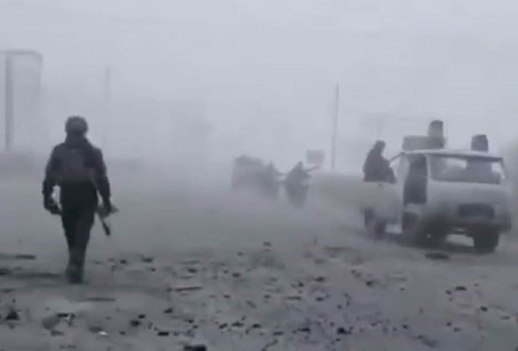 Βίντεο δείχνουν στρατιώτες να κρέμονται από κατεστραμμένα οχήματα και μοτοσικλέτες, καθώς κινούνται σε δρόμο γεμάτο συντρίμμια, ενώ ένα σπασμένο drone φαίνεται πεσμένο στο πλάι του δρόμου πριν η φάλαγγα χαθεί μέσα στην ομίχλη.