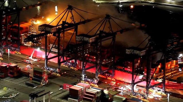 Ένα εμπορικό πλοίο στο λιμάνι του Λος Άντζελες τυλίχθηκε στις φλόγες μετά από έκρηξη, προκαλώντας διακοπή της ηλεκτροδότησης και της λειτουργίας των γερανών.