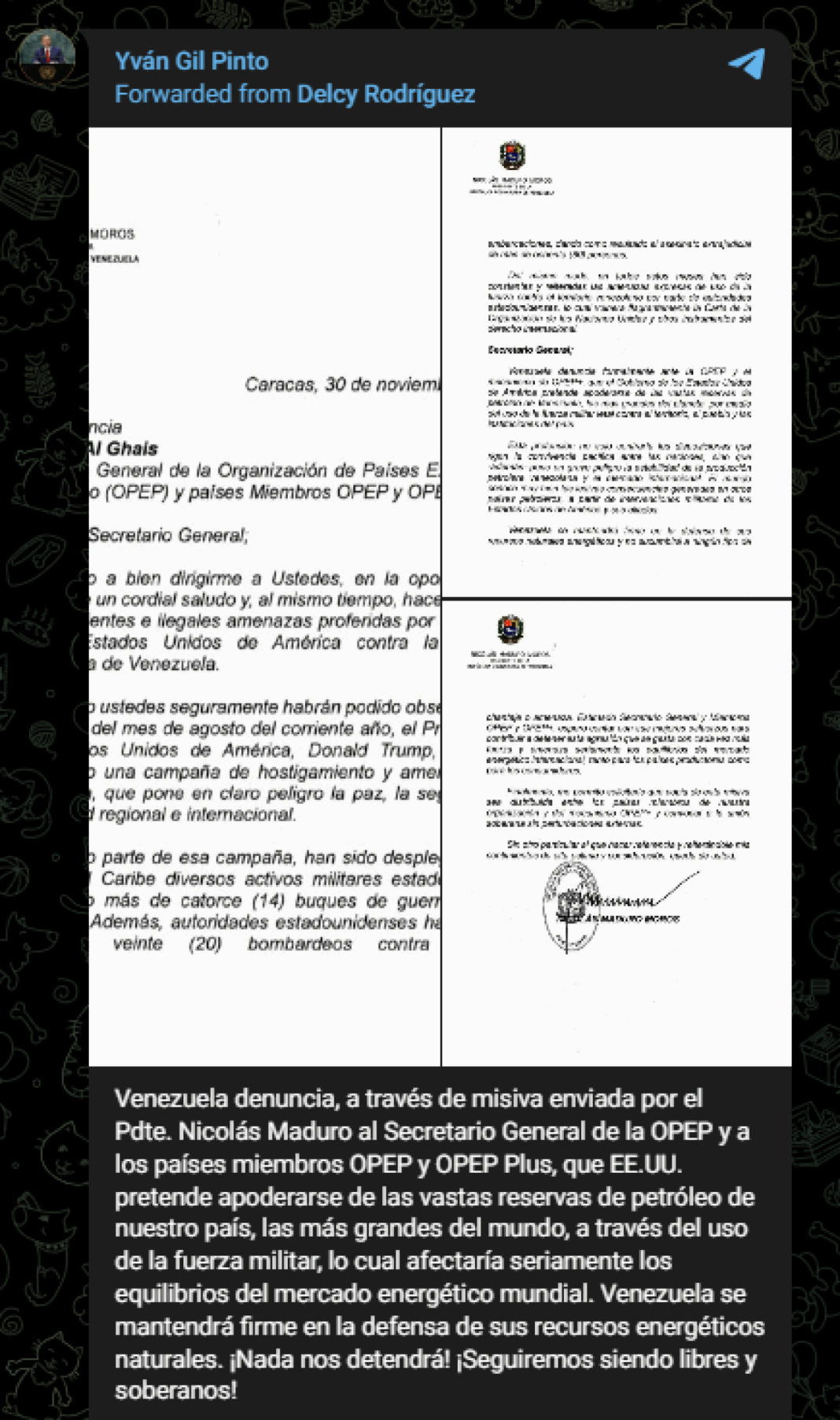 Στην επιστολή του, ο Μαδούρο αναφέρει ότι οι αμερικανικές απειλές «θέτουν σε σοβαρό κίνδυνο τη σταθερότητα της παραγωγής πετρελαίου της Βενεζουέλας αλλά και της διεθνούς αγοράς». Το περιεχόμενο της επιστολής δημοσίευσε ο υπουργός Εξωτερικών, Γιβάν Χιλ Πίντο, μέσα από τον λογαριασμό του στο Telegram, υπογραμμίζοντας πως η χώρα αντιμετωπίζει μια άμεση πρόκληση απέναντι στην κυριαρχία της.