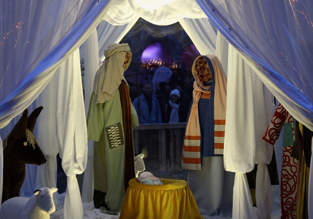 Η φάτνη, σχεδιασμένη από τη Victoria-Maria, παρουσιάζει μια μοντέρνα και συμβολική προσέγγιση με φιγούρες χωρίς πρόσωπα από ανακυκλωμένα υφάσματα, προωθώντας την ιδέα της συμπερίληψης.