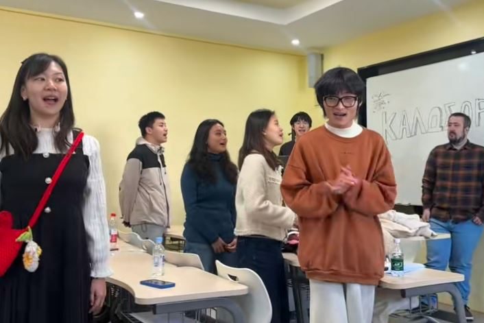 Κινέζοι φοιτητές ερμηνεύουν με συγκίνηση ελληνικό τραγούδι, αποδεικνύοντας την αγάπη τους για την ελληνική γλώσσα και τον πολιτισμό στο Πανεπιστήμιο Ξένων Σπουδών του Πεκίνου
