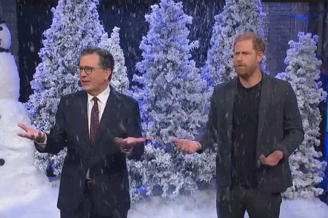 Τεχνητό χιόνι άρχισε να πέφτει καθώς ο δούκας του Σάσεξ αστειεύτηκε για το πόσο «όμορφος πρίγκιπας» είναι και πώς ο Κόλμπερτ πρέπει να «απλά πιστέψει» στη μαγεία των Χριστουγέννων, πριν ο παρουσιαστής του πει ότι έχει «πάρει το ρόλο» του «επίσημου πρίγκιπα των Χριστουγέννων του “Late Show”», με επευφημίες από το κοινό.