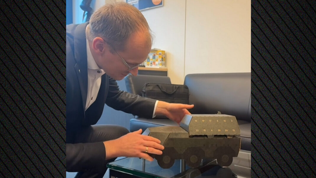 Χριστουγεννιάτικο ημερολόγιο στο σχήμα του νέου άρματος μάχης Lynx, φτιαγμένο από χαρτόνι, με τις παραδοσιακές 24 πόρτες που κλείνουν πίσω τους σοκολάτα, έστειλε στους συνεργάτες της η γερμανική βιομηχανία όπλων Rheinmetall, προκαλώντας ποικίλες αντιδράσεις.