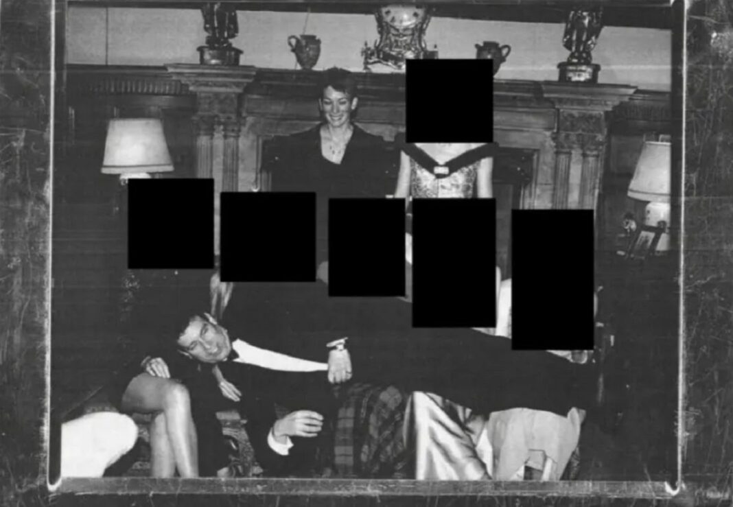Χαμογελώντας στην κάμερα, το μάγουλό του είναι ελάχιστα εκατοστά πάνω από τα γυμνά πόδια μιας από τις γυναίκες. Σε αυτή την ακατέργαστη σκηνή πρωταγωνιστεί η Γκισλέιν Μάξγουελ, η μαστροπός του Έπσταϊν. Ακριβώς αριστερά της είναι ορατή η κρυφή πόρτα που οδηγεί στο δωμάτιο στο Sandringham House όπου ο Γεώργιος Ε’ μετέδωσε το πρώτο του χριστουγεννιάτικο ραδιοφωνικό μήνυμα το 1932.