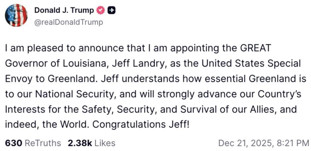 Χθες, Κυριακή, ο Ντόναλντ Τραμπ είχε ανακοινώσει ότι διορίζει τον κυβερνήτη της Λουιζιάνας, Τζεφ Λάντρι, ειδικό απεσταλμένο στη Γροιλανδία και είχε γράψει σε ανάρτησή του στο Truth Social: «Ο Τζεφ καταλαβαίνει πόσο απαραίτητη είναι η Γροιλανδία για την Εθνική Ασφάλειά μας και θα προωθήσει σθεναρά τα Συμφέροντα της Χώρας μας για την Ασφάλεια, και την Επιβίωση των Συμμάχων μας και βεβαίως του Κόσμου».