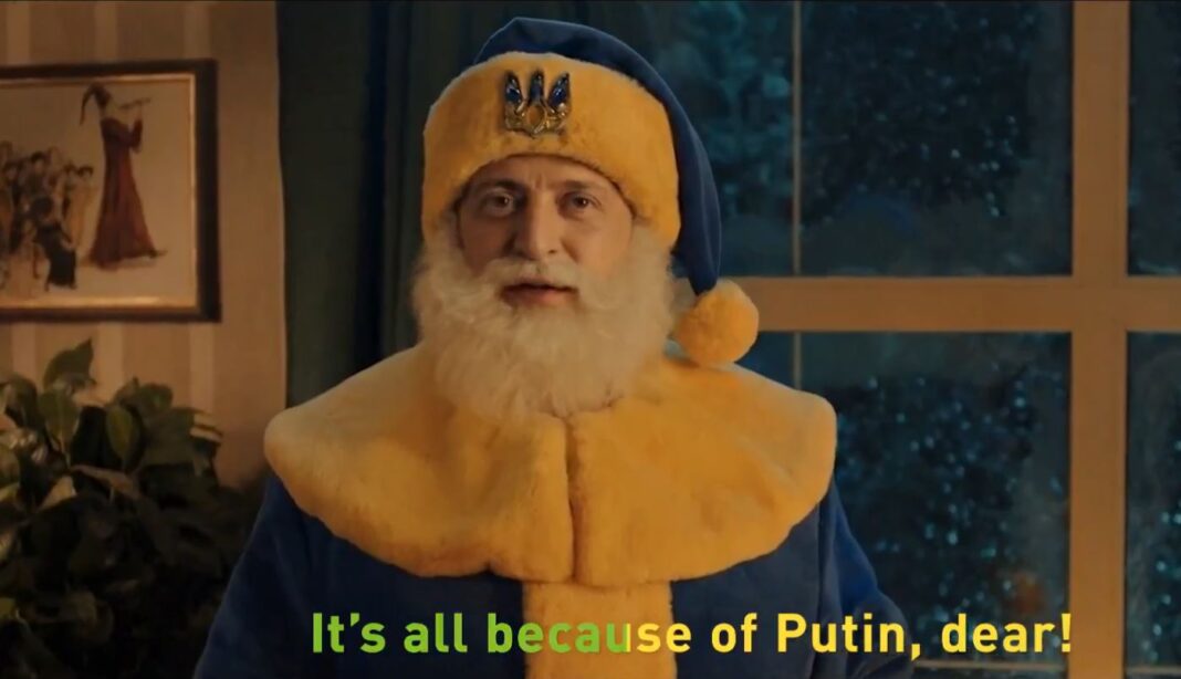 Στα επόμενα πλάνα, εμφανίζεται ο Βολοντίμιρ Ζελένσκι ως Άγιος Βασίλης στα χρώματα της Ουκρανίας να αρπάζει τα δώρα των παιδιών αλλά «για όλα φταίει ο Πούτιν». «Δεν έχετε κάποια ελπίδα για τα φετινά Χριστούγεννα; Για όλα φταίει η απειλή του Πούτιν» συνεχίζει το βίντεο.