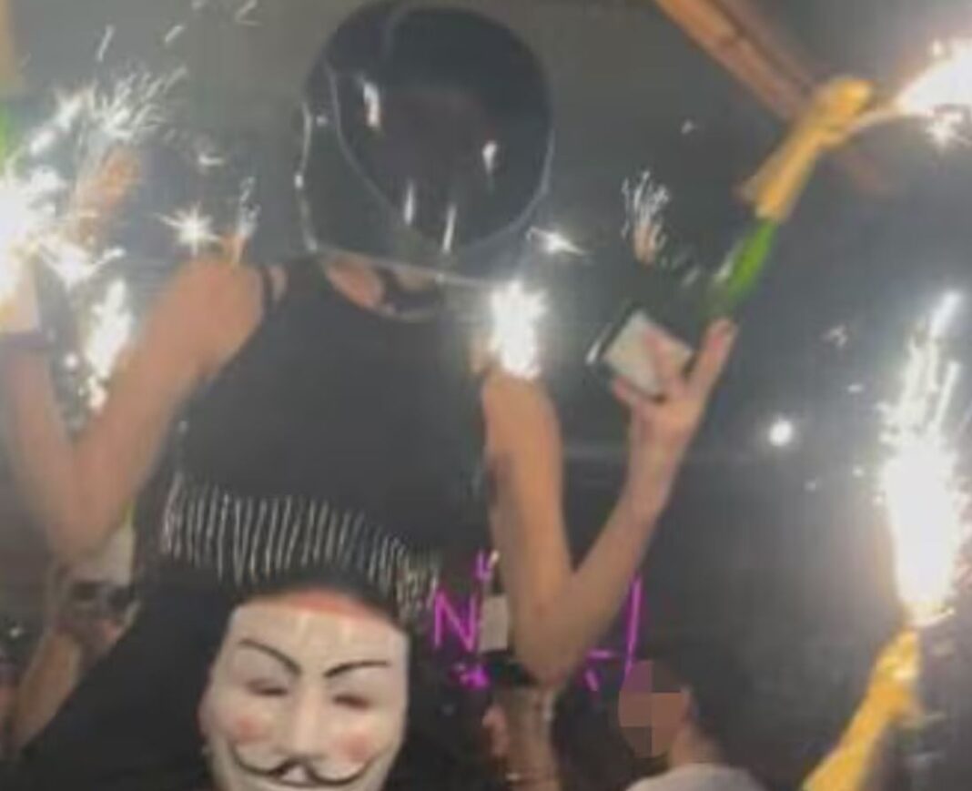 Μία εικόνα δείχνει μια γυναίκα στους ώμους ενός άλλου ατόμου που φοράει μάσκα, κρατώντας δύο μπουκάλια που περιέχουν βεγγαλικά.