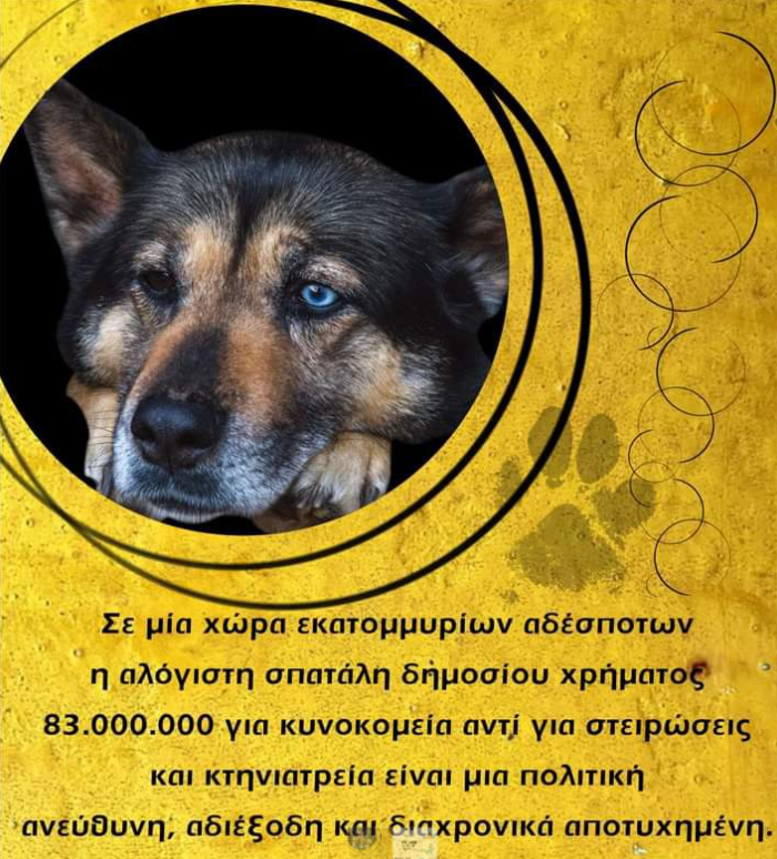 Αντί τα κονδύλια του Υπουργείου Εσωτερικών να κατευθύνονται σε συνεχείς και στοχευμένες στειρώσεις άστεγων ζώων, στη συνεχή σίτιση αυτών με τις κατάλληλες τροφές, σε ιατροφαρμακευτικές και χειρουργικές ανάγκες, σε εκπαίδευση του προσωπικού, σε μέτρα για την ευζωία των ζώων, σε στειρώσεις μη άστεγων-δεσποζόμενων ζώων
