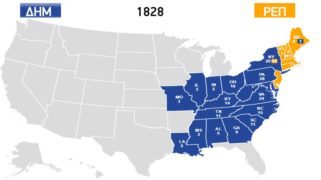 1828 Εκλογές 1828. Νίκη των Δημοκρατικών με τον Άντριου Τζάκσον έναντι των Εθνικών Δημοκρατών (National Republicans) του Τζόν Κουίνσι Άνταμς. Το κόμμα των Εθνικών Δημοκρατών ήταν πρόγονος του ριζοσπαστικού κόμματος Γουίγκ (Whig) που με τη σειρά του ήταν πρόγονος του σημερινού Ρεπουμπλικανικού Κόμματος.