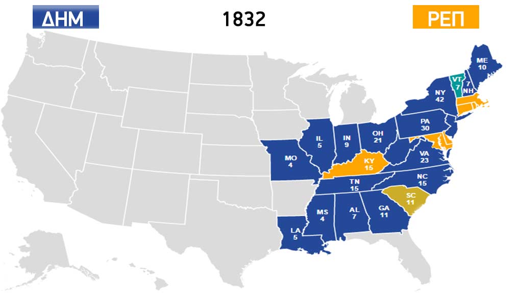 1832 Εκλογές 1832. Οι Δημοκρατικοί κυριαρχούν εύκολα και ο Άντριου Τζάκσον επανεκλέγεται Πρόεδρος με μεγάλη διαφορά από τον Χένρι Κλέι των Εθνικών Δημοκρατών. Η προεκλογική διαμάχη περιεστράφη γύρω από την Δεύτερη Τράπεζα (Second Bank) των HΠΑ που ήθελε να κλείσει οΤζάκσον, εχθρός του χάρτινου χρήματος και των τραπεζών. Ο αριθμός των πολιτειών είναι 24 όπως και στις εκλογές του 1828.